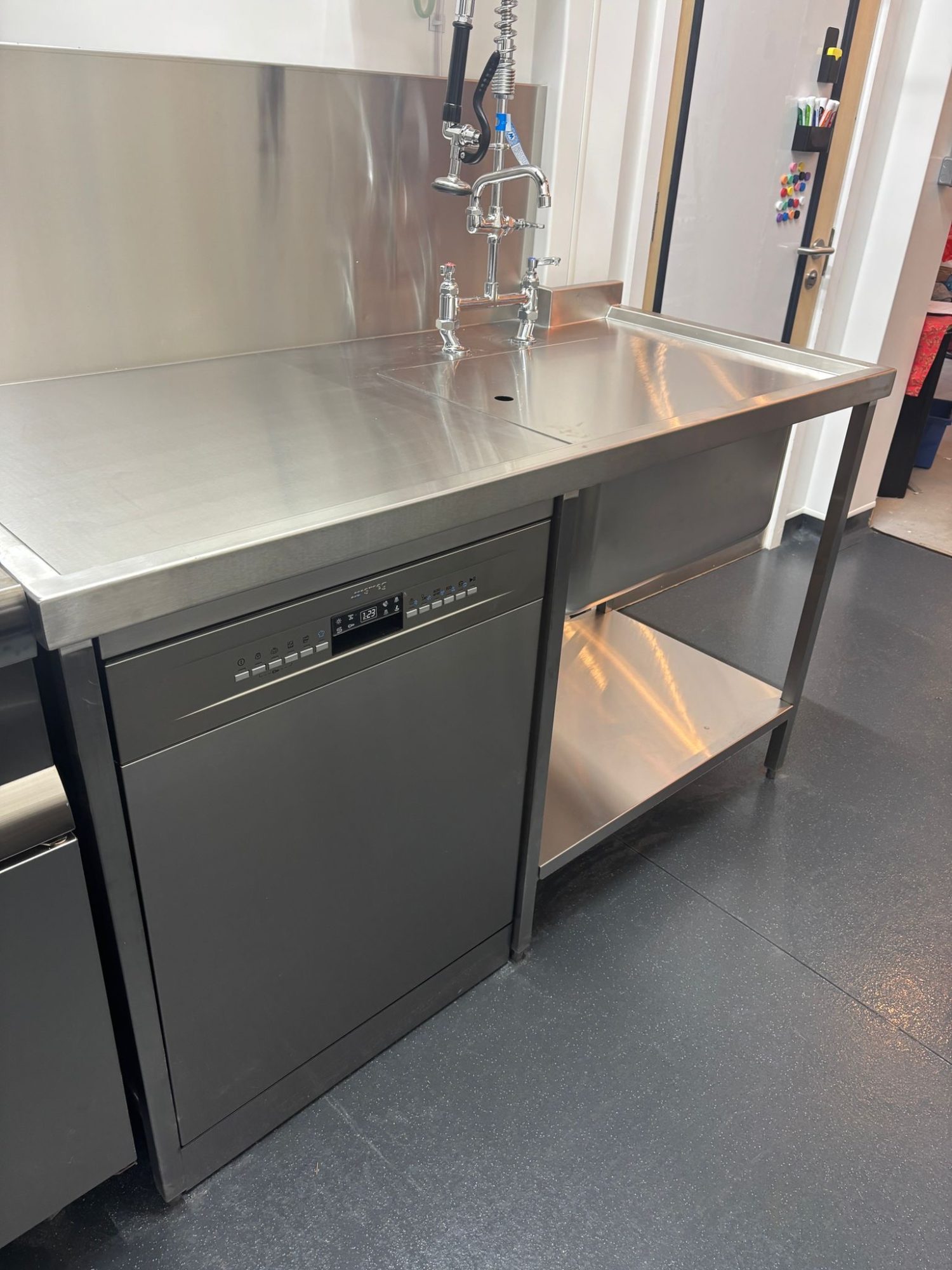 The anti-slip flooring improved safety. The bespoke stainless fabrication provided durable prep and wash areas. The Lincat 6-burner oven range delivered the power required for group cooking sessions, while the semi-commercial Smeg dishwasher ensured reliable and efficient clean-down.